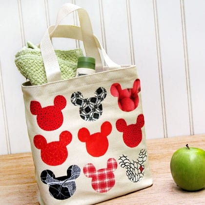 - Continue attaching fabric Mickey heads to the tote in this manner to complete the design.