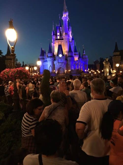 Scott wanted to get a center spot, in front of the Partners statue, so he could get a better recording of the show. Opening night was difficult to get a good view, as there were so many people. We got to the hub area about 7:30 and people were already putting down ponchos and towels to secure their spot for the 9:00 show. The center spot he hoped for was gone. So, we stood to the side, he secured a new location and we left to grab a Starbucks before Happily Ever After started. After all, we had an hour till showtime, that’s plenty of time. Right? Well…. it wasn’t. Scott started texting me to hurry back, because he was surrounded with people and he wasn’t sure if we’d be able to get back to him. I grabbed the coffee and the kids and we stepped back out onto Main Street. Oh my goodness! Just in that short period of time, the street was filled with people! I had to hang onto the kids and say “excuse me” dozens of times and climb over people on the ground just to get back to him. Once I finally did, I took this picture of the sea of people behind me.