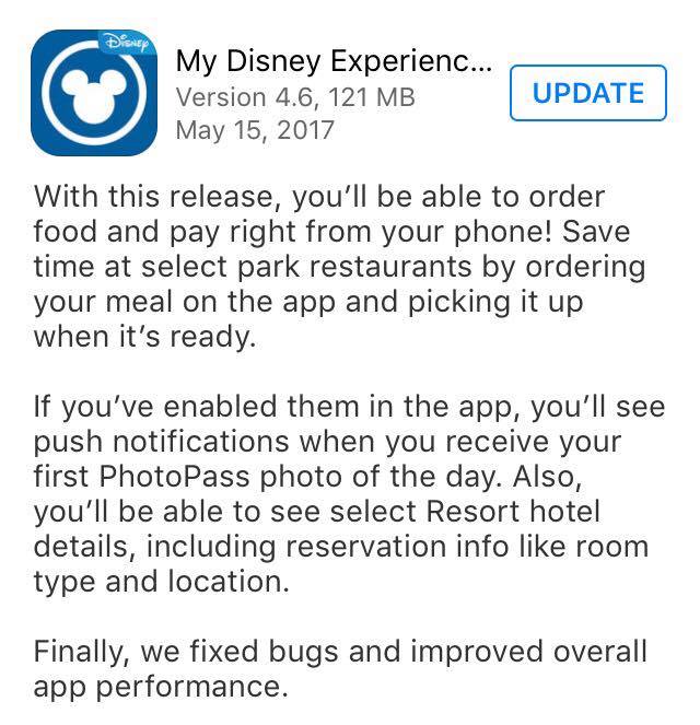Did you know there is a new update available for Walt Disney World’s My Disney Experience app? Recently we shared with you information about the exciting new “Mobile Order” counter service feature that now lets guests order and pay for their food right in MDE. But that wasn’t the only new feature that was added to MDE in the May 15 update. MDE now features two new options that many guests will find useful when trying to learn more about their Disney resort or when they just can’t wait to see their memories. The first new option gives guests access to more information about their resort than ever before. Not only can guests now see more specific resort information related to their reservation (room type and location) but now they can easily see details on what their resort has to offer! With one tap guests can now see what dining, recreation, events, entertainment and shopping options are available at their resort. There is even information on spas and tours for select applicable resorts. Many guests also miss the great “Guest Services” option that helps them find information on resort ATMs, front desk service, package pickup, mail services and more. The second new addition to MDE now gives guests who have enabled app alerts notifications on their phone when their PhotoPass photos are available in their app. So now instead of refreshing your app over and over to see if that great ride photo that you can’t wait to share on social media is available yet, all you have to do is alert to come through. This great option will save you time and hopefully cell phone battery!