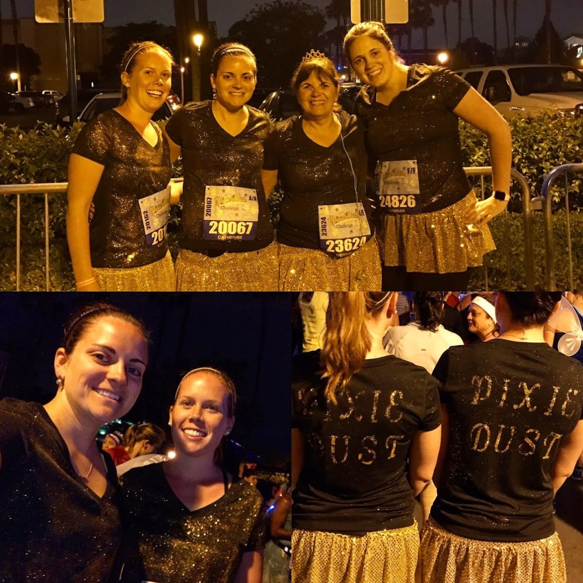 “Pixie dust.” I was told they wanted to run as pixie dust. Therefore our costumes were black shirts that were covered in glitter and then our signature gold sparkle skirts from Sparkle Athletic. You may ask how one gets glitter shirts from the East Coast to California, the answer is very carefully. The shirts were pre-glittered at my house and then they were double bagged in Ziploc bags for transport. I also packed extra glitter to apply as needed to the shirts. And yes, I did apply more glitter the night before the race in our hotel room. (I promise we left a nice tip for the cleaning staff the morning of the 10K. Thanks to whomever cleaned up after us!)