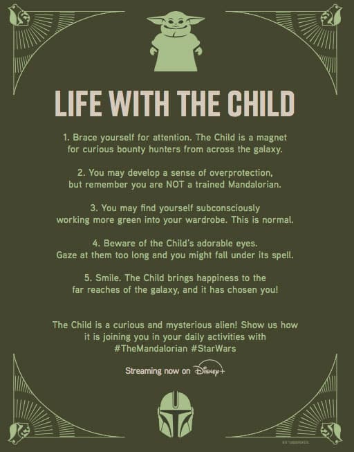 With the new series and May the 4th right around the corner, now is a great time to honor one of the fan-favorite characters from The Mandalorian – the Child. If you recently welcomed the Child into your home or are expecting the Child’s arrival any day now, here are some helpful tips on ways to integrate the Child into your everyday life: