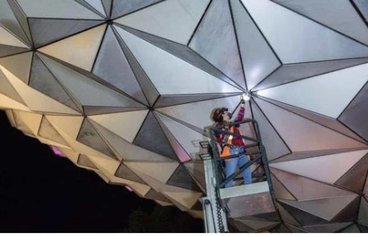 “Our team at Imagineering has been hard at work innovating the design and technology for this poetic and inspirational lighting concept,” Riddley said in an online post. “We’ve had to get quite ingenious in how we go about installing these new fixtures and all the high-tech systems so that they seamlessly integrate with the iconic profile of Spaceship Earth.”