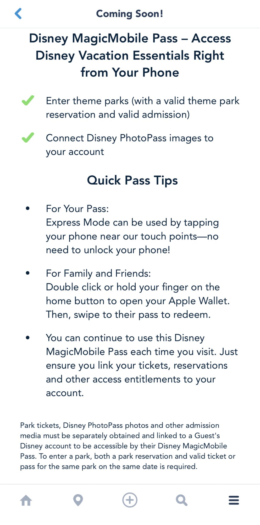 Again, this service is not yet functional. Although, you can currently find its future location on the My Disney Experience App’s menu. Upon clicking on it, you will be prompted with “Quick Pass Tips.”