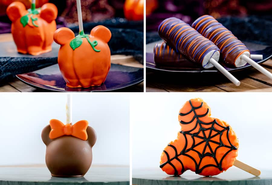 - Mickey Spider Web Rice Cereal Treat: Mickey-shaped crisped rice treat dipped in orange, white chocolate with a black dark chocolate web