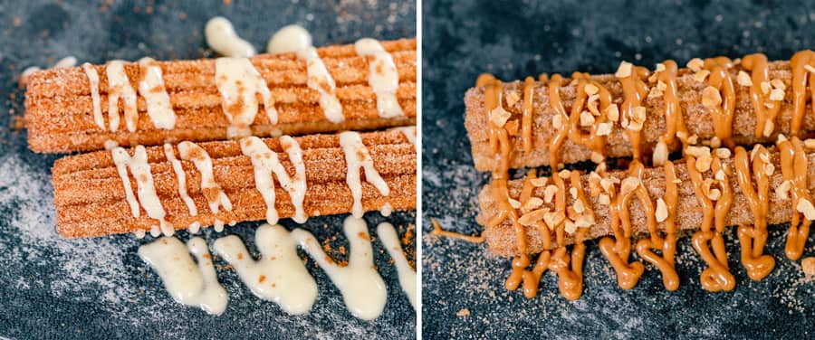 cinnamon sugar, drizzled with peanut butter and chocolate sauce, and topped