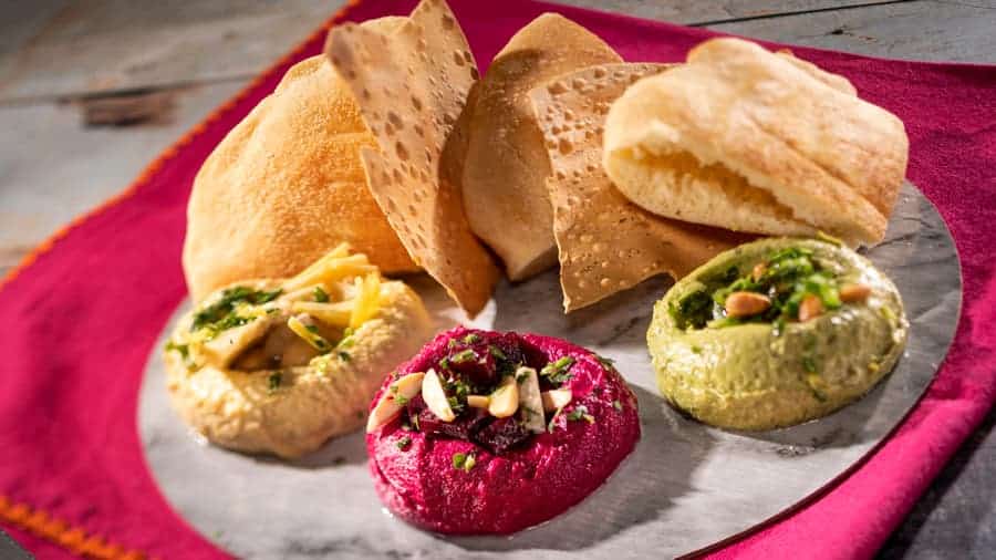 - Hummus Trio: Traditional hummus, red beet and black garlic hummus, and avocado-herb hummus with Moroccan bread and crispy papadam (New) (Plant-based)