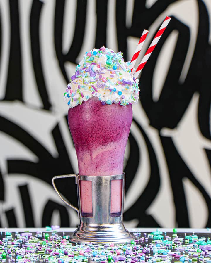 The Mermaid Classic Shake, a strawberry and blueberry shake topped with whipped cream & mermaid sprinkles is available at Black Tap Craft Burgers & Shakes in Downtown Disney.