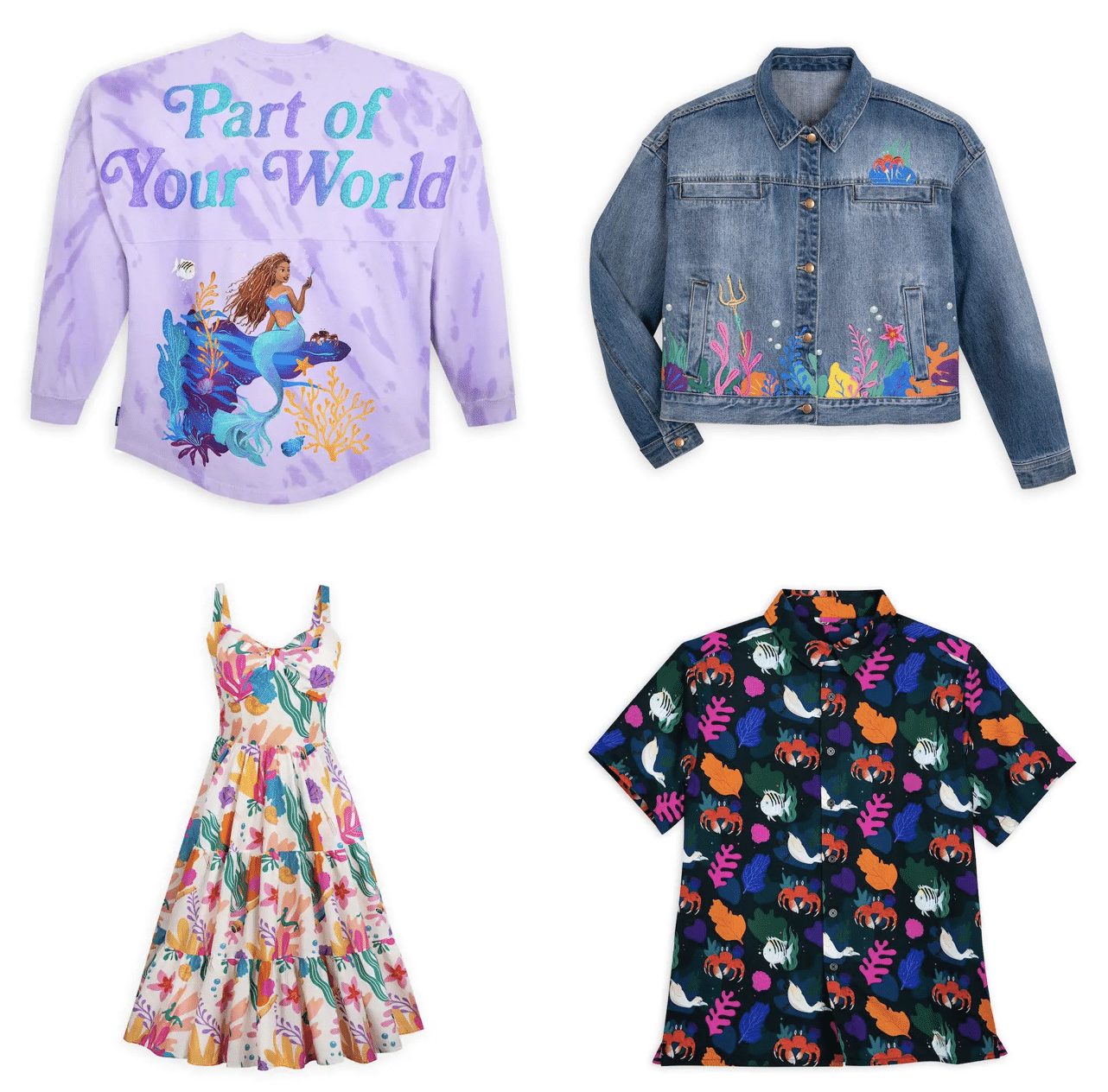 For adults looking to make a splash this summer with some ocean-inspired style, shopDisney and Disney Parks has you covered! Rise from the sea to greet your destiny in this dreamy pullover Ariel Spirit Jersey for Adults with an allover undersea dye effect, Ariel art and glittering ”Part of Your World” text inspired by the film. You’ll also be “ready to stand” with The Little Mermaid Denim Jacket for Women, featuring Ariel with her fishy friend Flounder and a colorful scenic slice of the ocean floor. Bring a splash of color to spring and summertime with this bold and bright dressfeaturing an allover aquatic print with signature items from the movie. The sleeveless cotton design includes a large bow on the bodice and a pieced skirt, so you’ll ride the next fashion wave in style! The Little Mermaid Woven Shirt for Men offers a different option for those looking to add underwater vibes to their closet, featuring a plant pattern with Sebastian, Flounder and Scuttle.