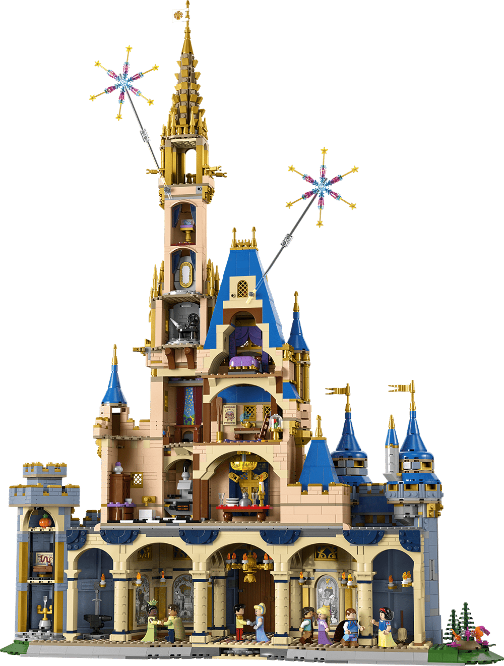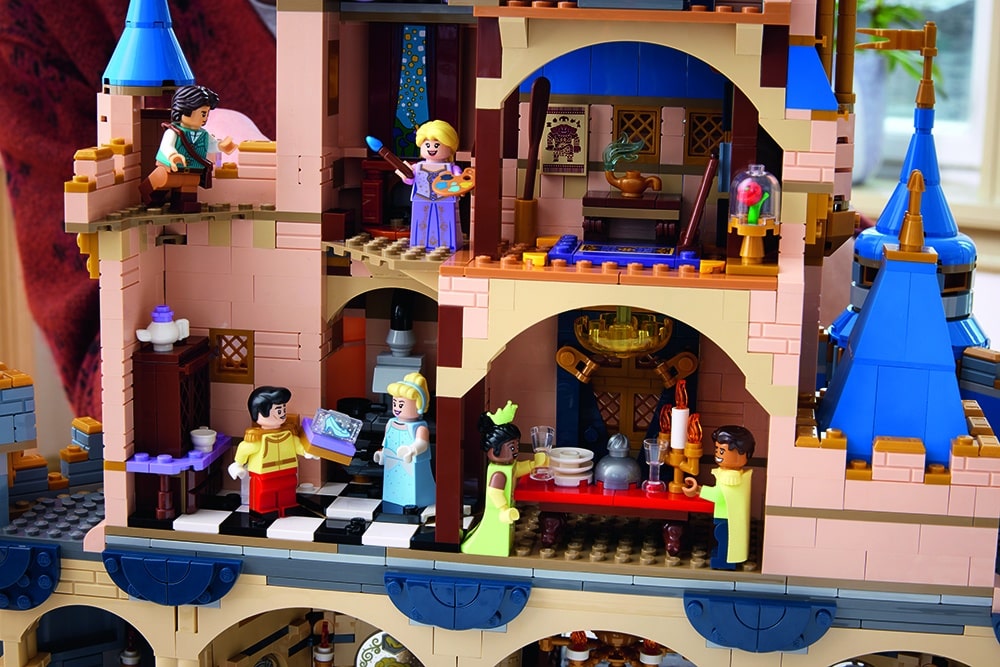 The set comes complete with eight minifigures, representing some of the Disney Princess characters and their male counterparts. Inside the castle is various rooms including a kitchen and dining room, a ballroom and bedroom. Each room has references to Disney films and characters and there is even a secret turret for fans to discover a Disney time capsule with references to the 100-year history. Outside, the castle is decorated with fireworks.