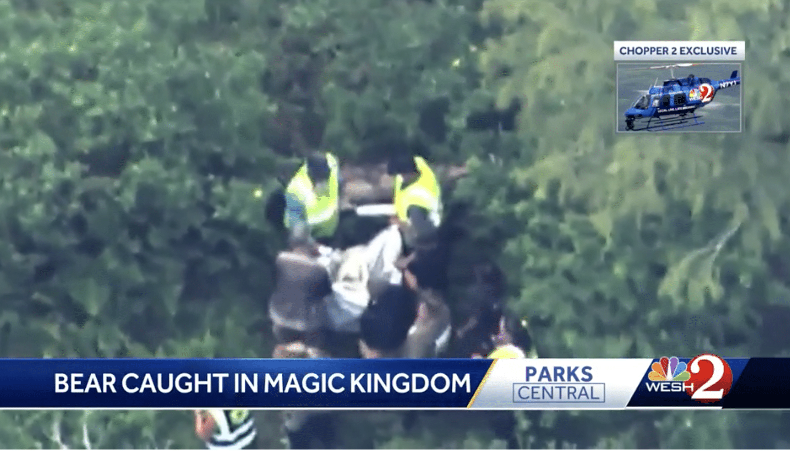 Around 1:30 p.m., aerial footage of the bear was captured by WESH 2 News, which showed the bear in a white tarp being carried by multiple law enforcement agents coming out of a wooded area.