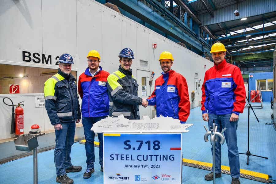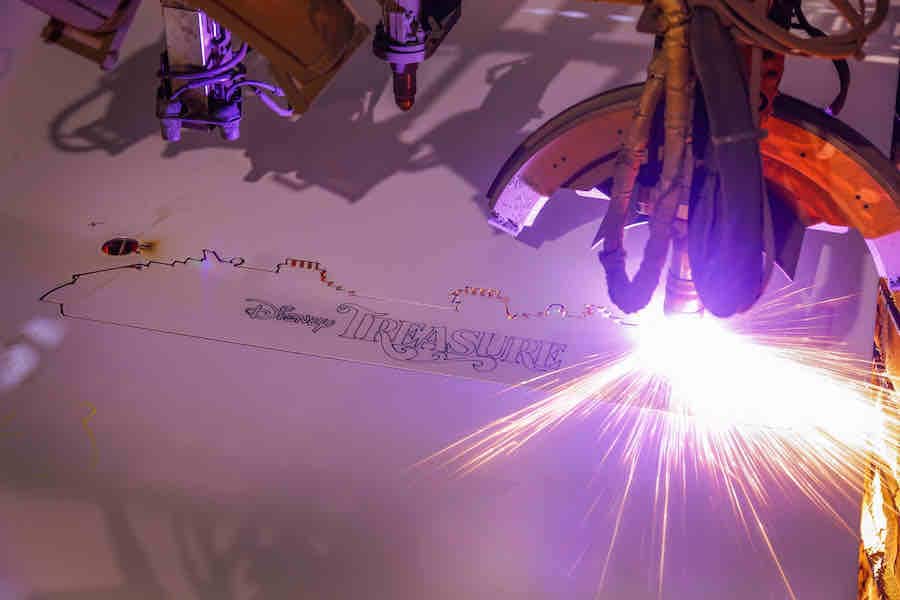 Today, the team at the Meyer Werft shipyard cut the first piece of steel for the Disney Treasure. Sparks were flying as a special machine called a plasma cutter, which is housed within the yard’s laser cutting room, was used to cut the steel in the shape of a Disney cruise ship. The ceremony was a huge milestone for Disney Imagineers and crew building the Disney Treasure, marking the official start of construction.