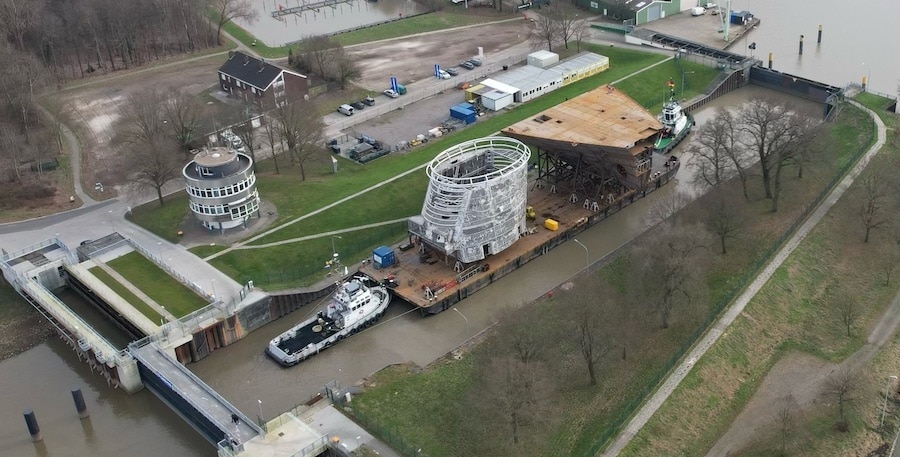 Another day at Meyer Werft shipyard means they’re another step closer to completing the Disney Treasure. One way to recognize a Disney Cruise Line vessel is to look for the iconic red funnels standing proudly on the top deck. The Disney Treasure will follow the sleek, classic aesthetic of all Disney Cruise Line ships that have come before it, meaning it will continue upholding the tradition of featuring the eye-catching funnels. Today the second funnel arrived at the shipyard from Poland. Pretty soon, it will receive a coat of bright red paint and be installed on the ship. It’s a thrilling time for the Disney Treasure as more and more pieces of the ship arrive.