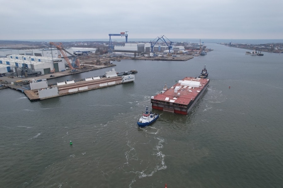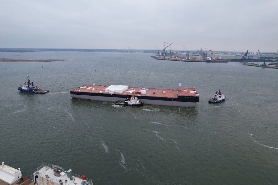 Today, the Meyer Werft shipyard in Papenburg, Germany received a very exciting delivery from Rostock, Germany– the Disney Treasure’s Floating Engine Room Unit! The Floating Engine Room Unit, sometimes called a FERU for short, is a critical piece when it comes to building the Disney Treasure. Upon the ship’s completion, the FERU will serve as the main source of power, housing the main motors and liquified natural gas tanks. The FERU is also where all the auxiliary machinery needed for cooling water, fuel, air supply and other essential support systems will be kept. The above picture shows the FERU during its journey from Denmark!