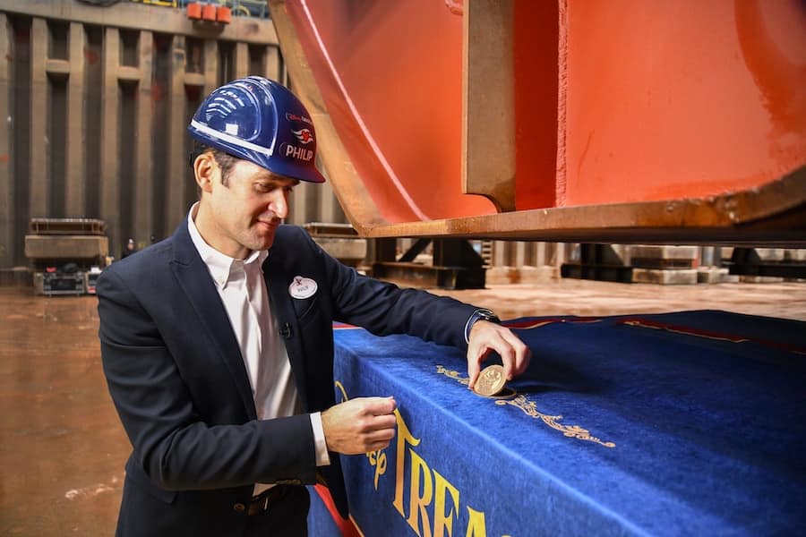 The weather in Germany may have been rainy, but spirits were high thanks to the completion of another maritime milestone for the Disney Treasure – the Keel Laying Ceremony. As a part of the ceremony, a newly minted coin is placed under the keel of the ship to foster good fortune for the ship and its crew in the years to come. Just like the steel-cutting ceremony, keel laying traditions date back to the times of wooden ships. The coin itself is quite unique and depicts a carved portrait of Captain Minnie Mouse, sporting a fashionable new adventure outfit designed for the new ship.