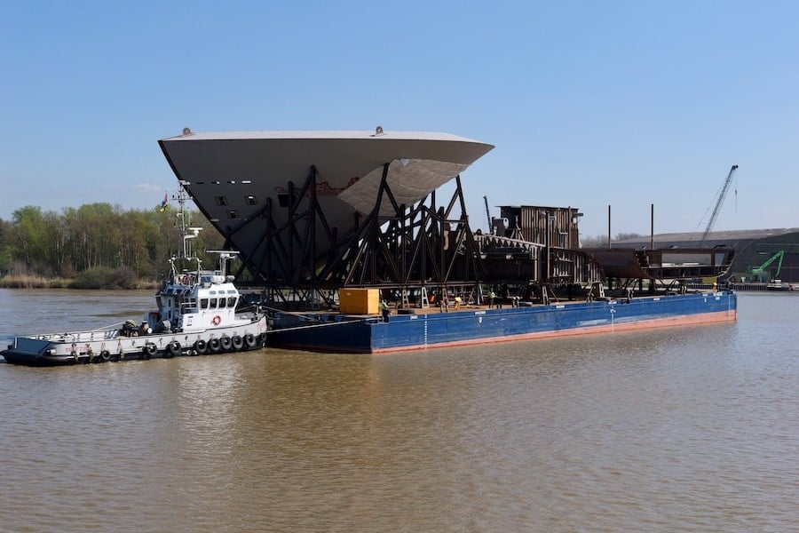 The bow of the Disney Treasure has made its way to Meyer Werft shipyard in Papenburg, Germany, arriving today aboard a barge with the aid of a helpful towboat. This photo showcases a first step in the installation process for the ship’s bow filigree, which is being protected by a large tarp. The outline of the design has already been sketched out in red ink on the ship’s surface and will be completed at a later point in the construction process.