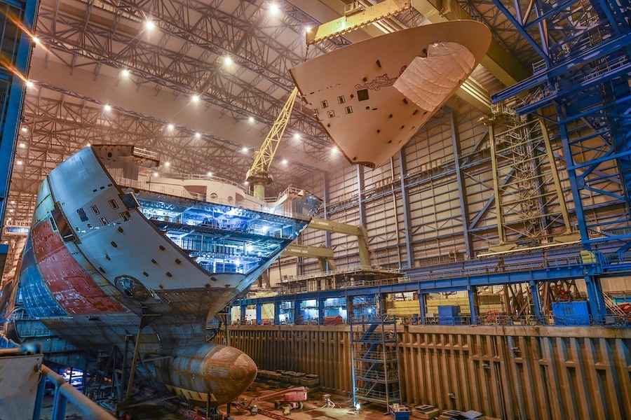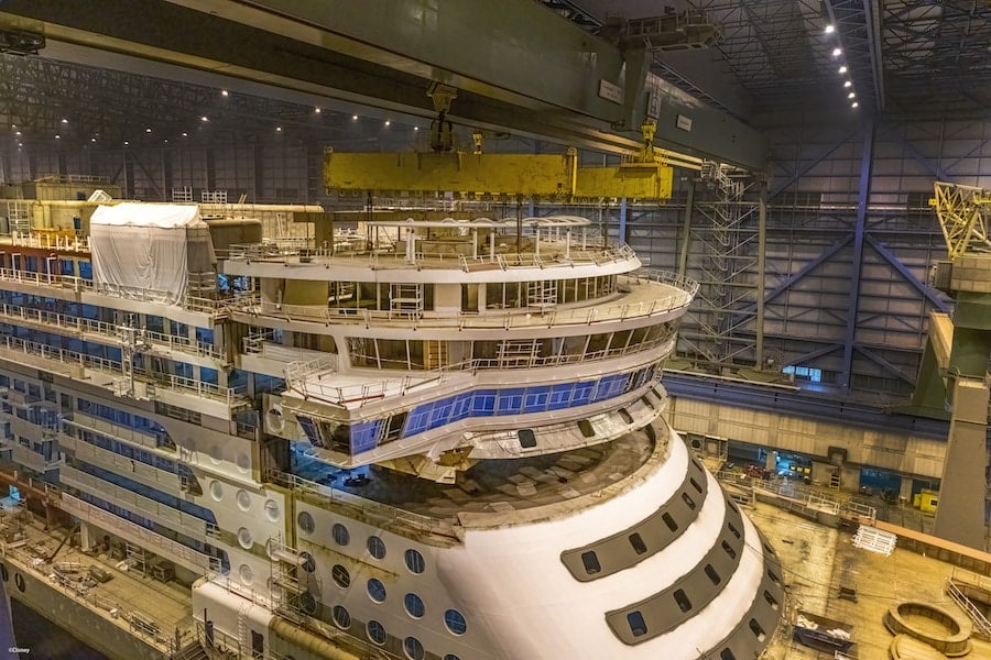 The Disney Treasure has reached yet another milestone in construction – the completion of its last block! In case you’re not familiar with this maritime milestone, it’s important to know that cruise ships are built in blocks (sections). With the last block in place, this means that the ship is now structurally complete and outfitting work can begin.