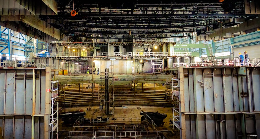 The Disney Treasure will continue the Disney Cruise Line tradition of bringing Broadway-style stage shows across the globe in a grand entertainment venue fit for original Disney musicals. However, before the curtain rises and performers dazzle future Disney Cruise Line guests, Disney Imagineers and crew at Meyer Werft shipyard must weld what will someday become The Walt Disney Theatre to the Disney Treasure. It’s exciting to think that this space will soon be filled with Disney tunes and the heartwarming stories of favorite Disney adventurers!