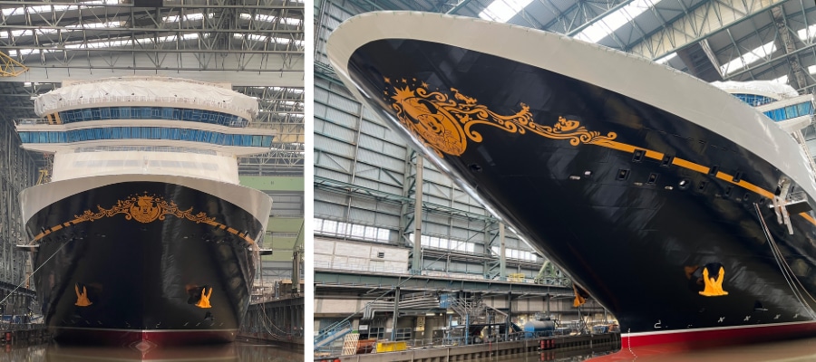 It’s a new year with new progress being made on the Disney Treasure at Meyer Werft Shipyard in Papenburg Germany. Regular Ship’s Log readers may remember April’s surprise reveal of the Disney Treasure bow artwork. The whimsical design, which features Captain Minnie Mouse in her signature adventure-themed outfit, has now taken shape on the hull of the Disney Treasure. In step with the existing Disney Cruise Line fleet, the Disney Treasure continues a two-decades-long tradition of carrying a unique character-inspired art piece on its bow. Its completion marks an exciting milestone for the Disney Treasure as it begins the next stage of construction. The installation process began when the shipyard team welded a number of pre-cut steel plates to the Disney Treasure’s hull. Once the framework of the design had been secured, the plates were painted by hand to obtain their iconic golden hue and sealed with a special topcoat. The artwork is just one of the many details that will distinguish the Disney Treasure when it sets sail later this year!