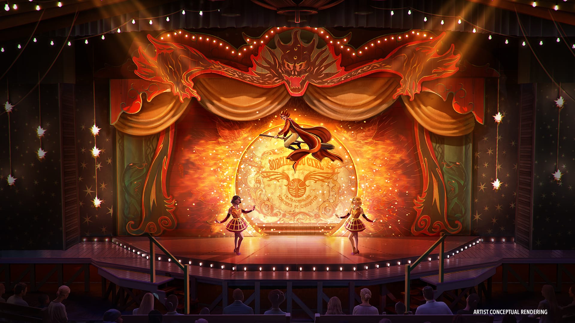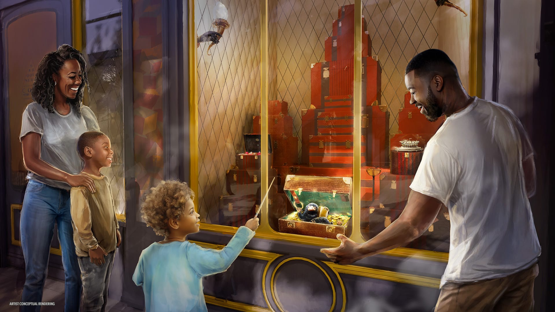 Beyond the world’s ornate portal, guests will first journey from a Muggle park in Paris into the breathtaking spectacle of 1920’s Place Cachée – a hidden, bustling shopping district in wizarding Paris lined with Haussmannian buildings, shops, sidewalk cafés, and historic Parisian domes rising in the distance. Here, wizards and non-magiques alike will be enamored with the majestic grandeur and enchanting ambiance of the city as they cast dazzling spells throughout the magical streets using interactive wands, encounter fantastic beasts at a traveling circus, and – for the first time ever within The Wizarding World of Harry Potter – travel across countries and time to 1990s London using the Métro-Floo for a thrilling adventure set inside the iconic British Ministry of Magic.